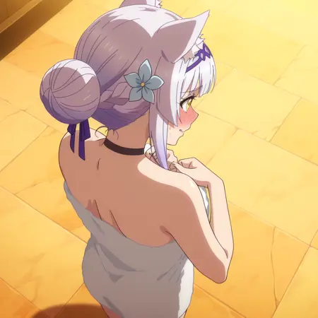 ClaireOnsen, single hair bun, short hair, naked towel,