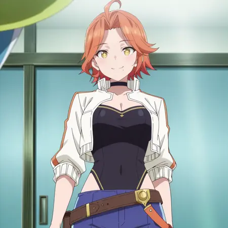 白色夹克,短款夹克,露胸,黑色紧身衣,衣服下穿紧身衣,蓝色长裤,腰带,