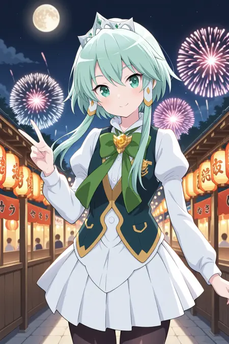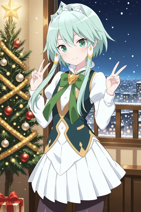 lucia rea regulus, green hair, short hair with long locks, green eyes, hair tubes, tiara