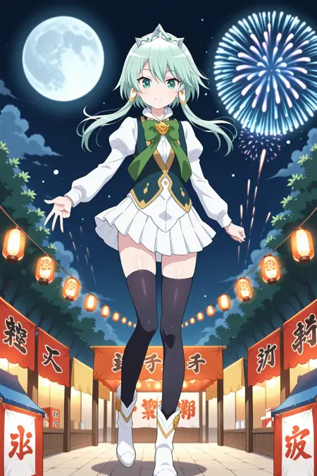 dress, vest, green bow, green bowtie, long sleeves, puffy sleeves, juliet sleeves, shirt, pleated skirt, white skirt, black pantypose, boots, white footwear