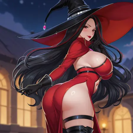 ahmtwe, 1girl, solo, black hair, long hair, streaked hair, mature female, large breasts, red eyes, red lips, navel, witch hat, thigh strap, gloves, red dress, side slit, thigh boots