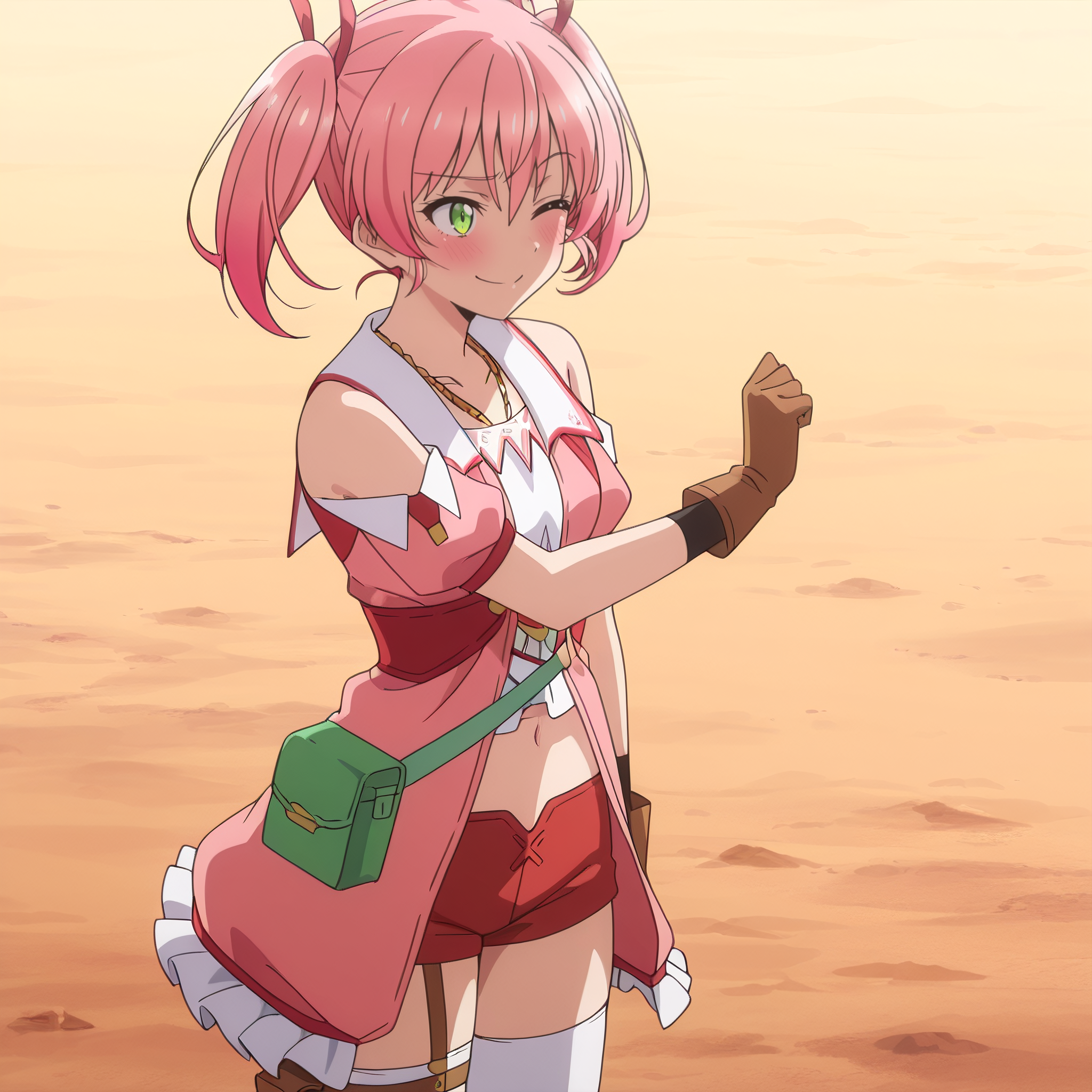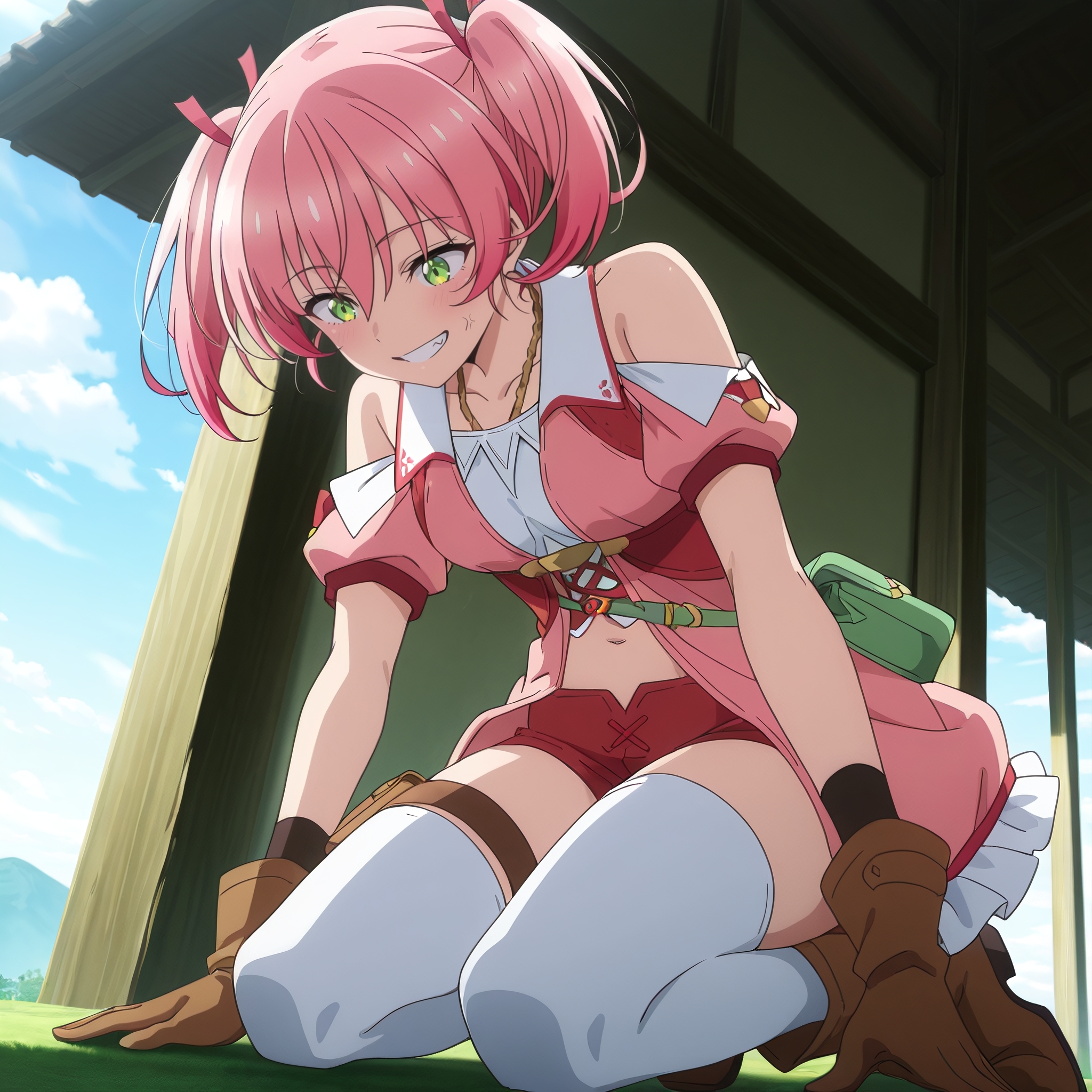 pink dress, frills, bare shoulders, short puffy sleeves, brown gloves, collarbone, white thighhighs, red shorts, short shorts, brown boots, green bag, shoulder cutout, navel, thigh strap, brown pouch,
