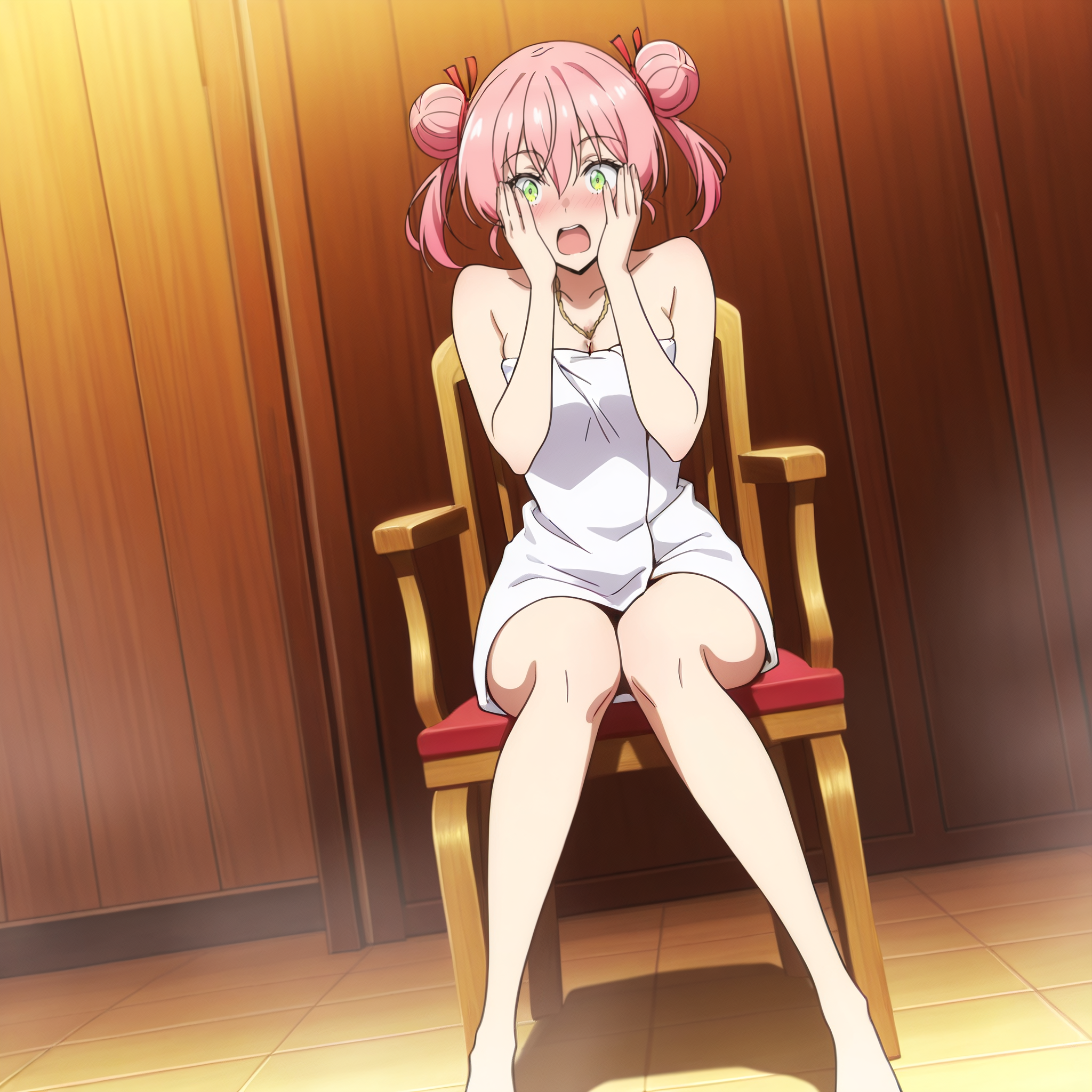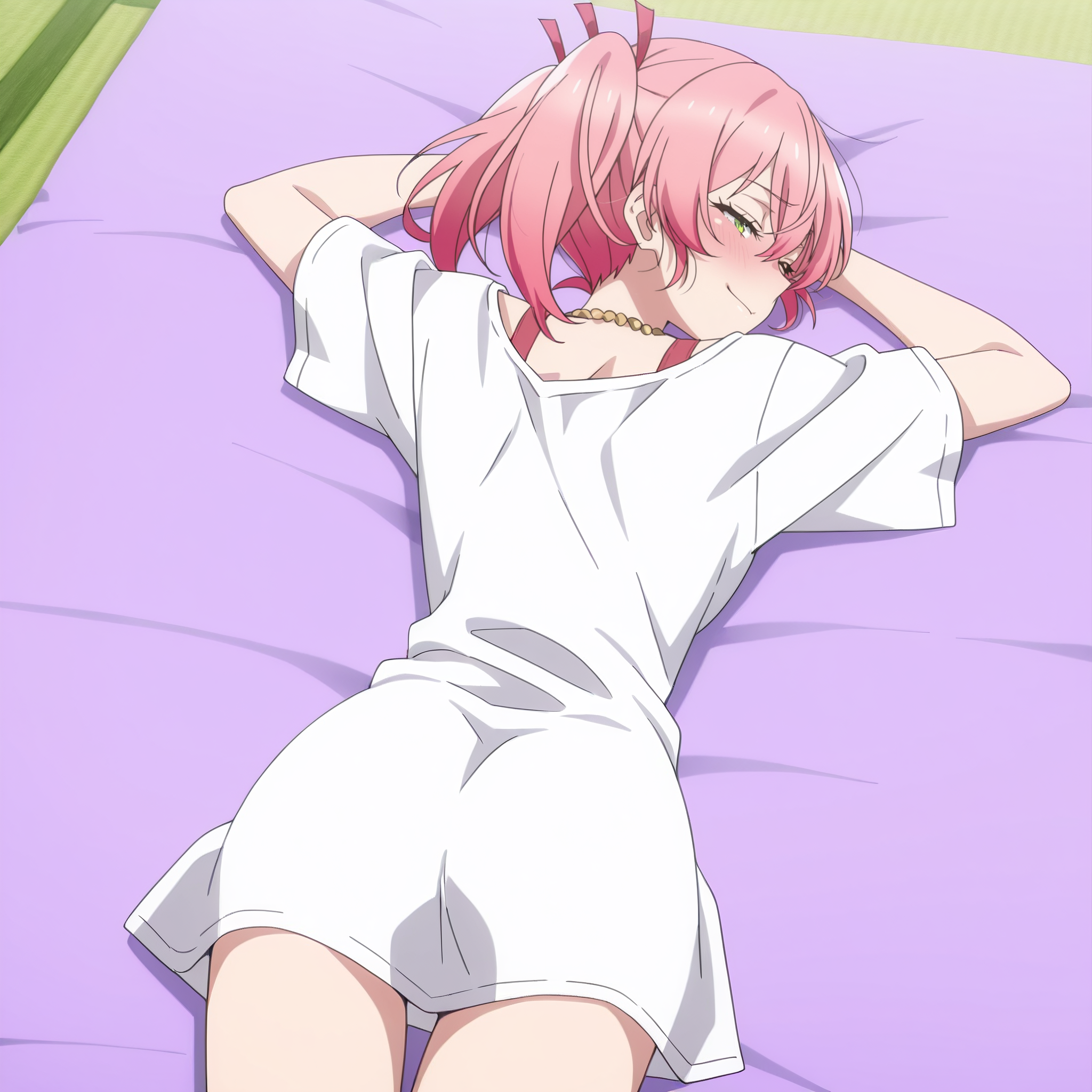SRAYui, pink hair, short hair, short twintails, green eyes, hair ribbon, red ribbon, jewelry, necklace, hair between eyes,
