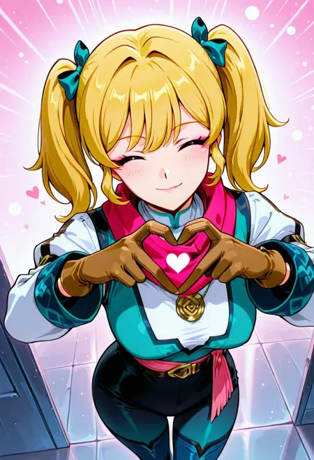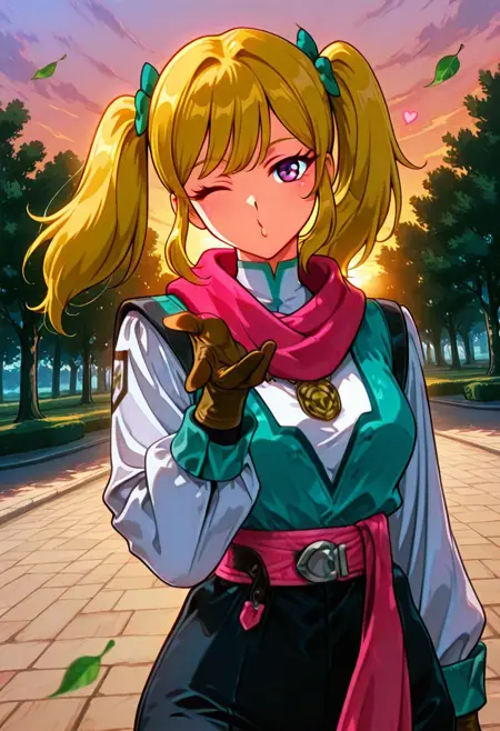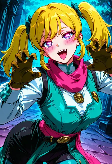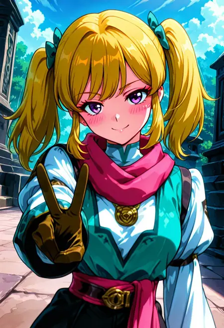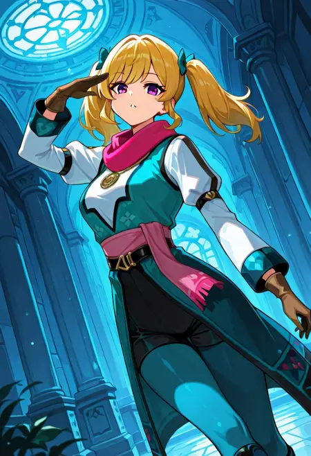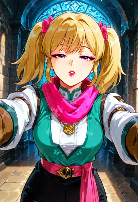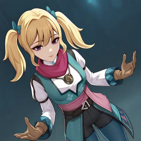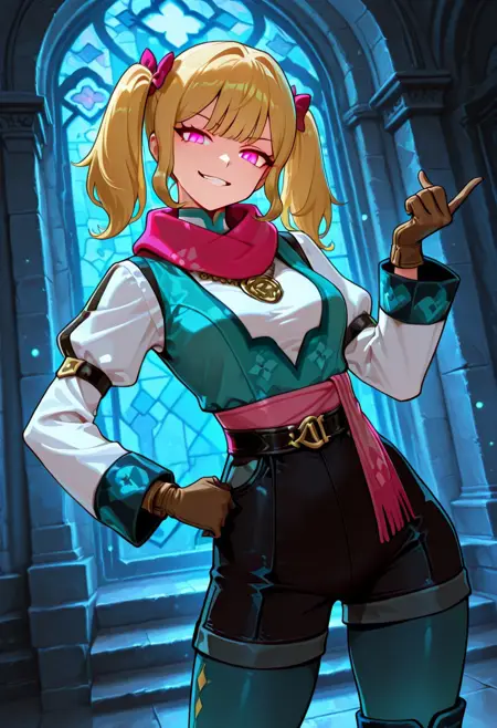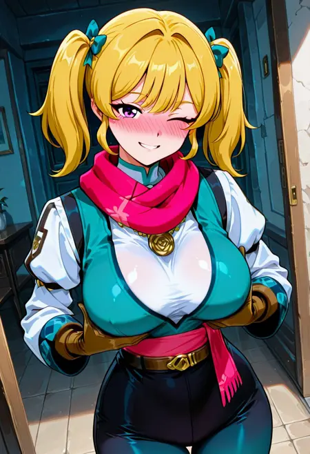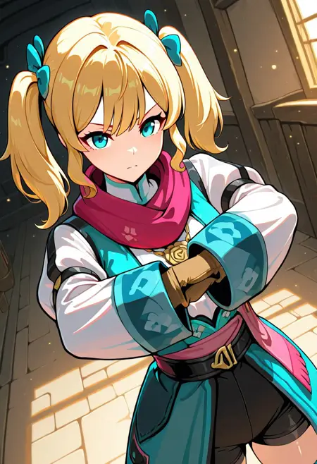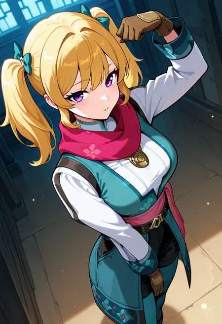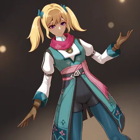NetochkaGI, 1소녀, 혼자, 금발, 더블테일, 앞머리, 머리장식, 머리 리본, 보라색 큰 눈, 두꺼운 입술, 반짝이는 눈, 밝은 분홍색 스카프, 흰색 긴 소매 블라우스, 금색 무늬가 있는 터키색 조끼, 가슴에 꽃 모양의 엠블럼, 큰 가슴, 벨트, 밝은 분홍색 끈, 검은색 단반바지, 넓은 엉덩이, 터키색 허벅지까지 오는 레깅스, 흰색 액센트가 있는 파란색 부츠, 갈색 장갑,