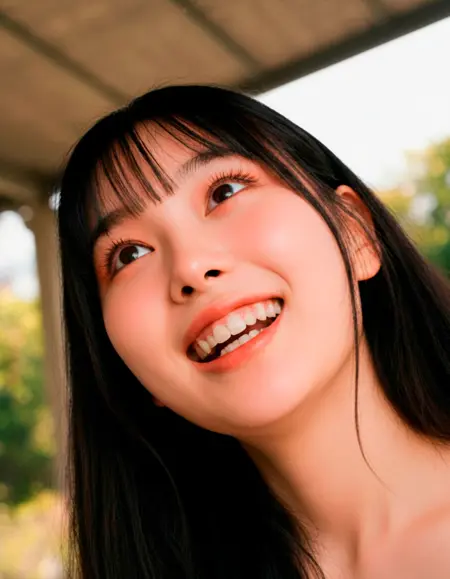 gimme_char, asian girl, wispy bangs, strand of hair on the side of her face, black hair, straight hair, natural makeup, professoinal makeup, orange eyeshadow, blushing