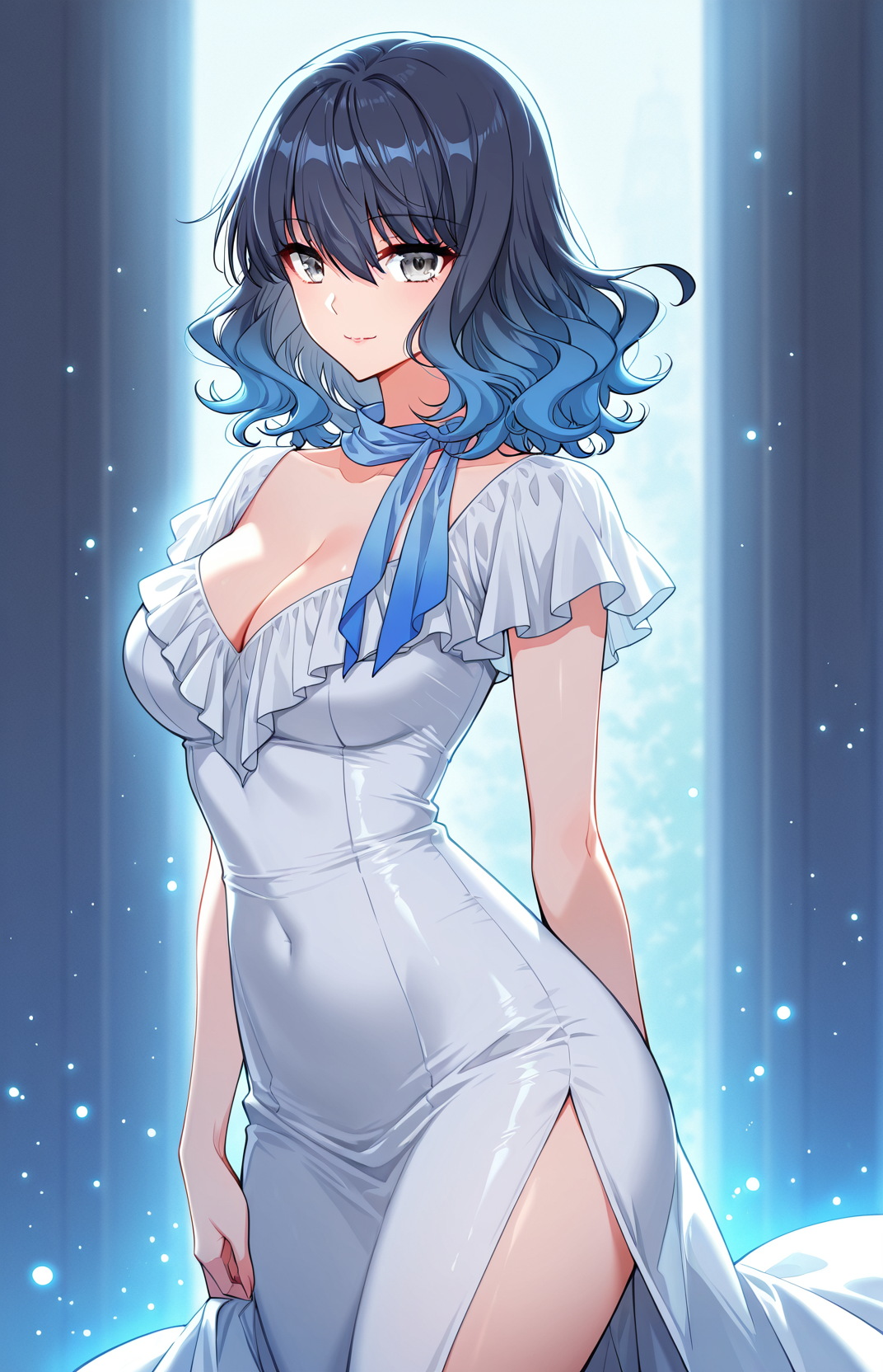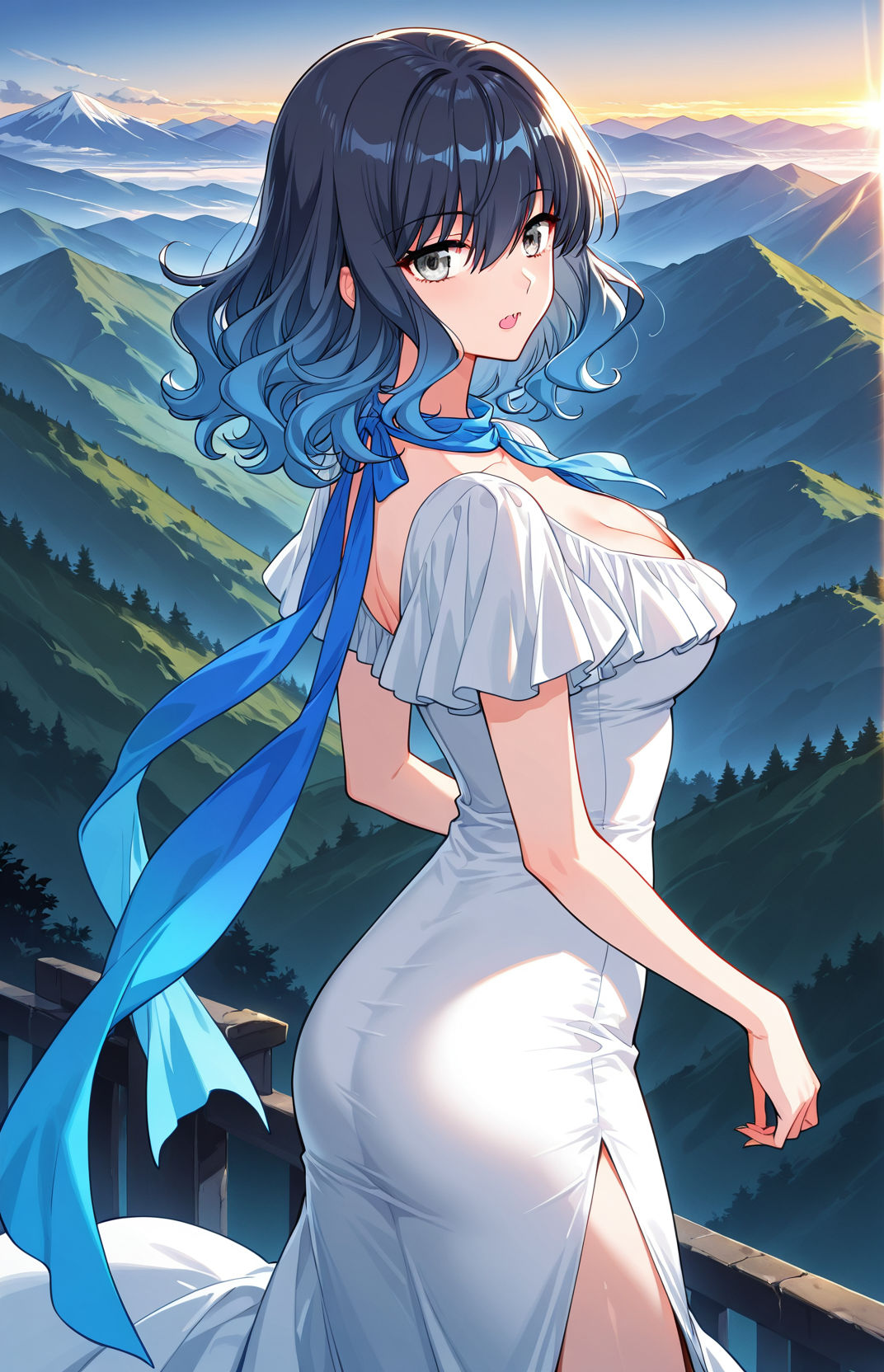 Fang_outfit、白いドレス、フリルの襟、胸元、短い袖、フリルの袖、青いスカーフ、ロングドレス、フィットしたドレス、ロングスカート、サイドスリット、