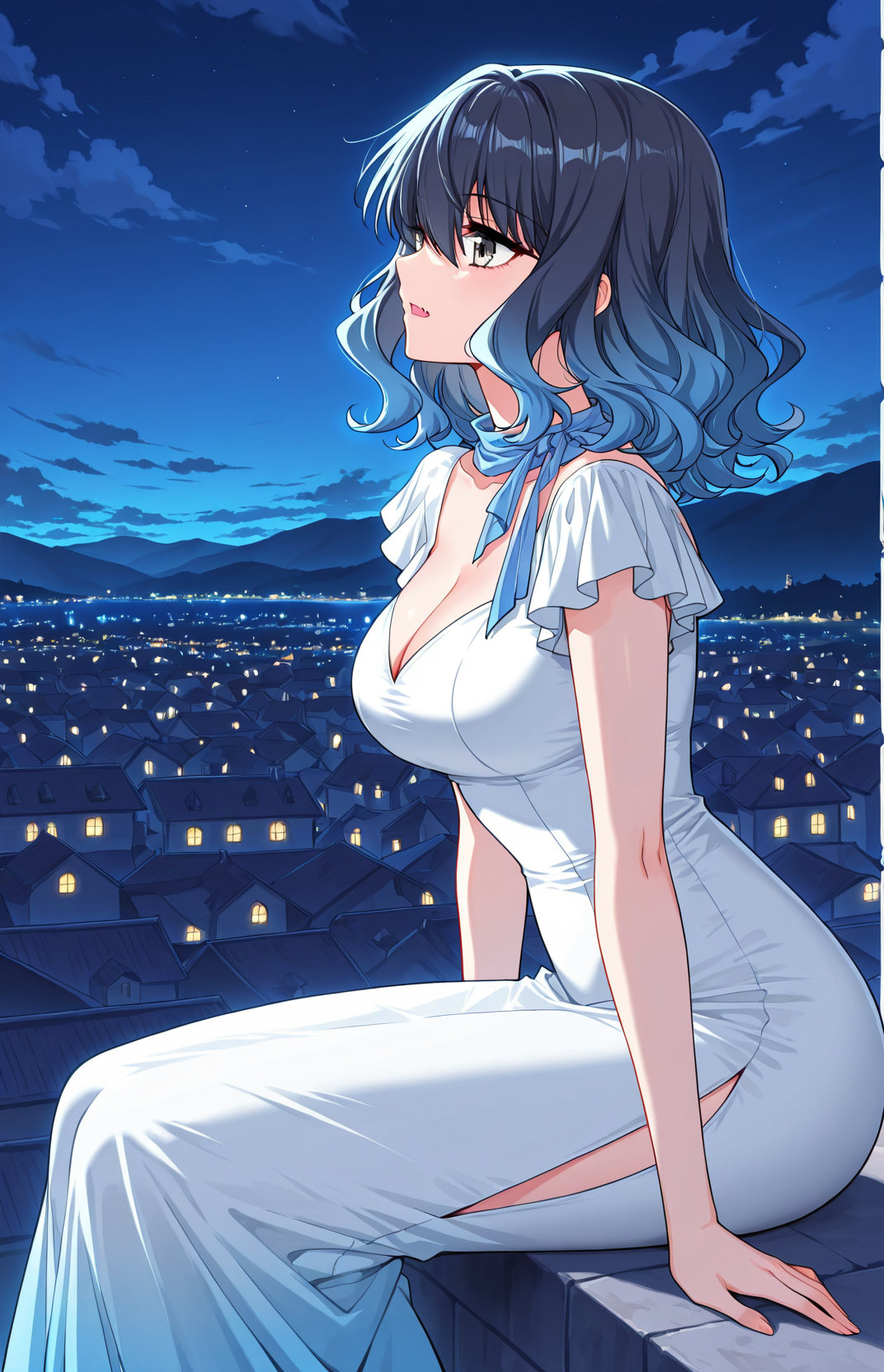Fang、1girl、シングル、銀灰色の目、ミディアムヘア、グラデーションヘア、濃紺の髪、薄青い先端、ウェーブヘア、不規則な前髪、フル前髪、長い前髪、目の間に髪、サイドロックス、