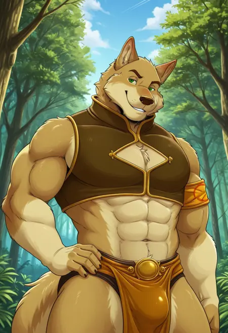 Reinforcement Prompts: "furry, male, green eyes, mature male, strongman waist, hairy, sparse chest hair"