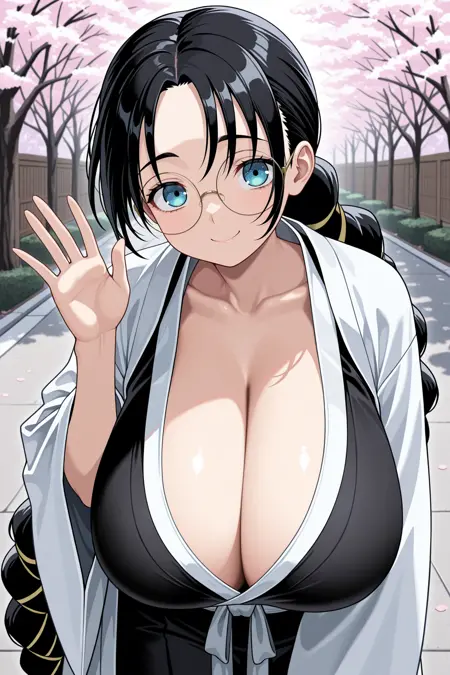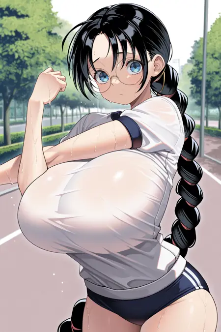 카토리 바츠운사이, 검은 머리, 매우 긴 머리, 갈라진 앞머리, 땋은 머리, 파란 눈, 안경, 둥근 안경, 큰 가슴