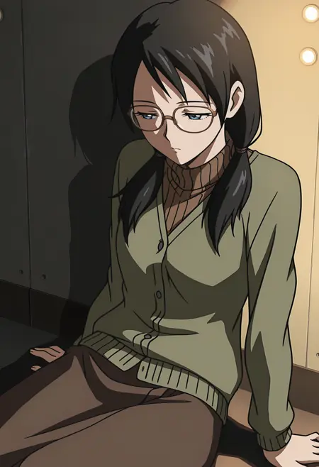 绿色开衫,棕色衬衫,条纹衬衫,长袖,棕色裙子,棕色框架眼镜,