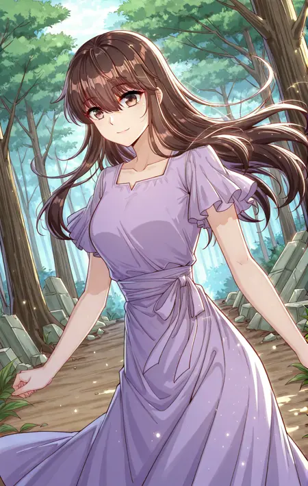 翔の服、ラベンダーのドレス、長いドレス、短い袖、フリル付き袖、絞られたウエスト、長いスカート、