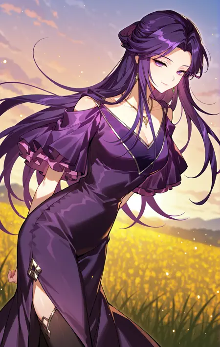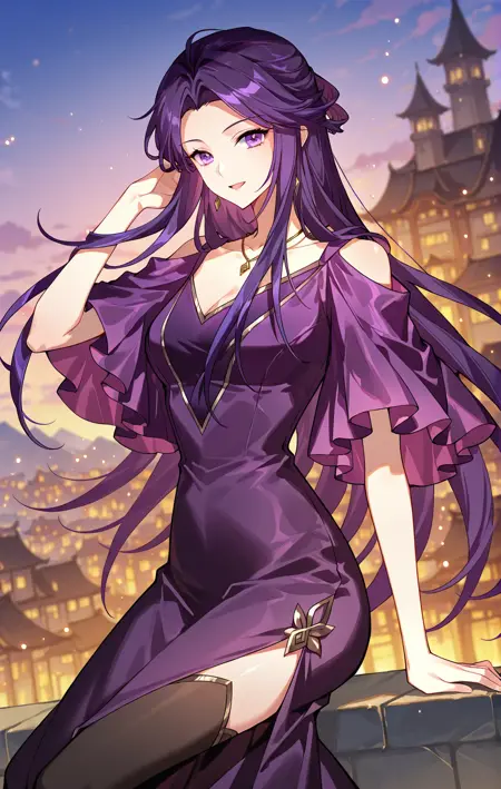 夜月服装,紫色连衣裙,露肩设计,连体袖子,荷叶边袖子,短袖,V领,银色镶边,收腰,长裙,侧开衩,金色扣子,黑色过膝袜,金色镶边过膝袜,金色项链,细项链,吊坠项链