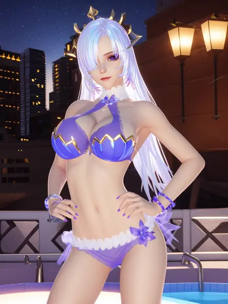 - QSJhaideliweiBLSG, 1girl, solo, jewelry, swimsuit, navel, bracelet, bikini, long hair, flower, nail polish, white hair, breasts,cityscape, night,mature female, looking at viewer, one eye covered, pool, hair ornament, purple eyes,