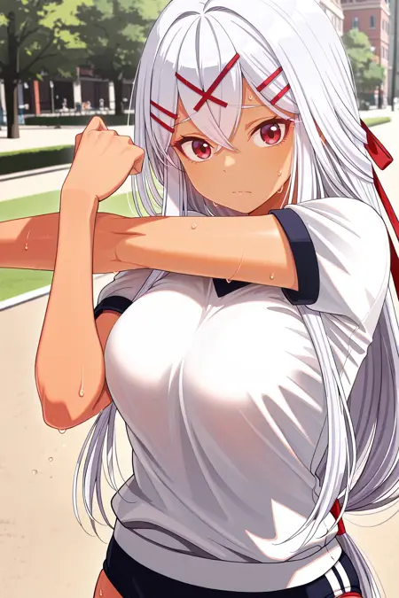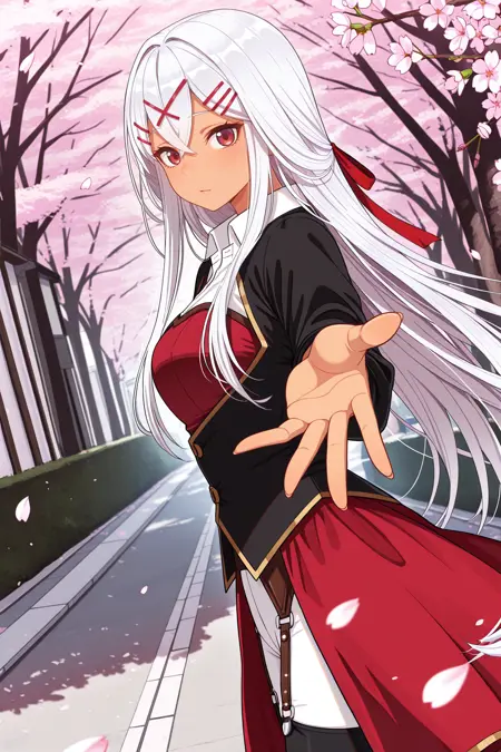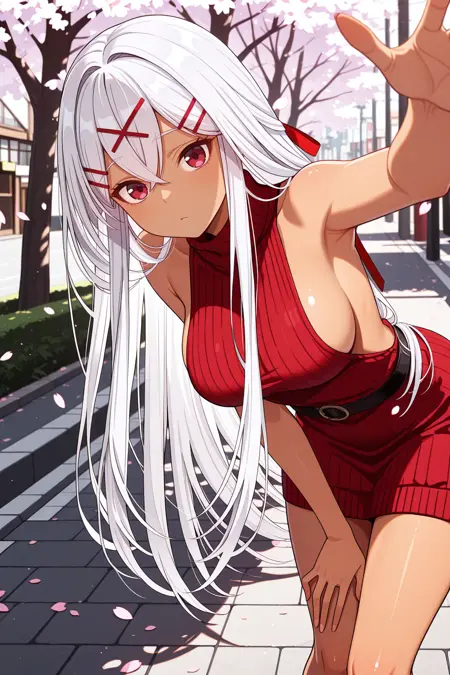 yulishia, 가로단발, 검은 피부의 여자, 눈 사이의 머리카락, 머리 장신구, 머리핀, 하얀 머리, 빨간 눈, 매우 긴 머리
