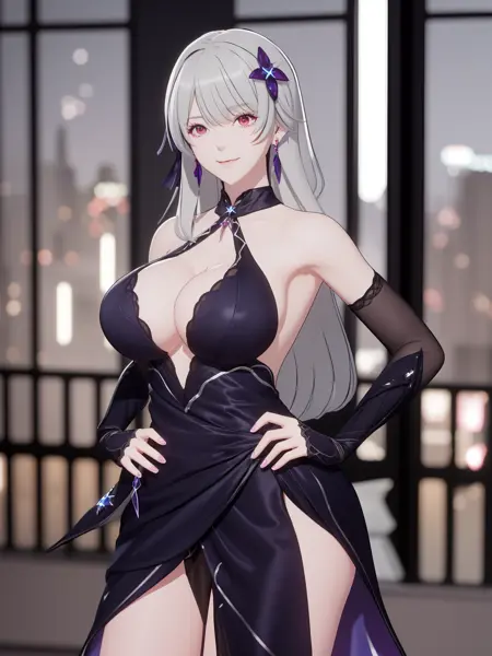 - SKZYhadisiMYYW, 1girl, dress, breasts, long hair, solo, jewelry, earrings, red eyes, looking at viewer, bare shoulders, cleavage, hair ornament, grey hair, bangs, bridal gauntlets, cityscape, night, mature female, pool, light smile,