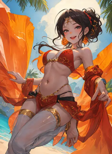This LoRA can generate Harem outfit, Dancer, as well as face veil (mouth veil) and see-through clothes.