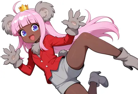 red jacket, long sleeves, grey shorts, koala gloves, koala ears, bear tail, grey high heels,