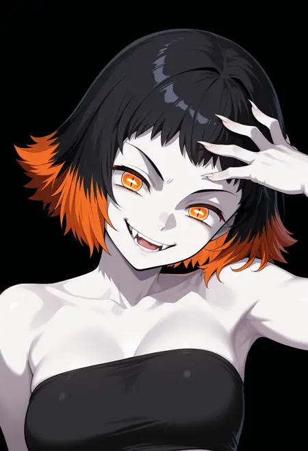 orange eyes, pale skin, slit pupils, black hair, orange hair, two-tone hair, short hair