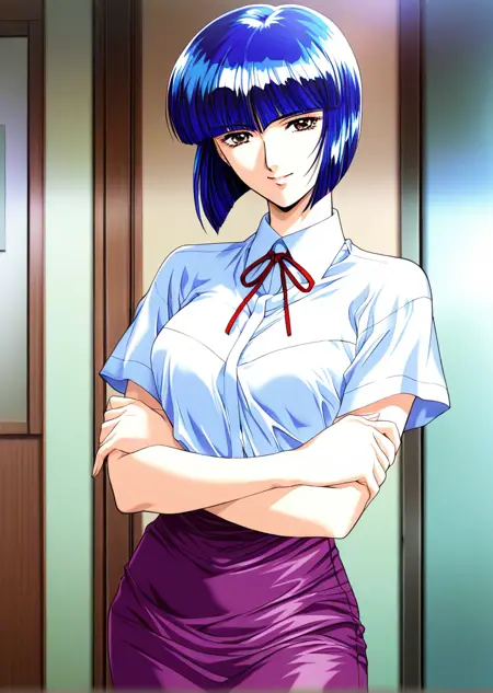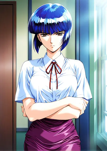 Kawarazaki_Sachiko, 1girl, solo, blue hair, short hair, blunt bangs, brown eyes, bob cut, medium breasts,