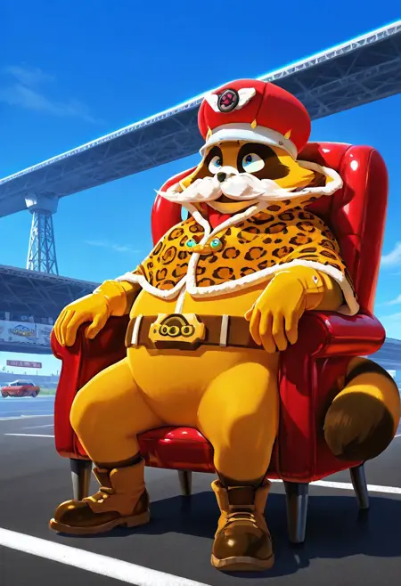 Dodon Pa, tanuki, brown face, blue eyes, white moustache, yellow skin, yellow and brown tail, red hat, leopard-skin coat, brown belt, yellow gloves, brown shoes