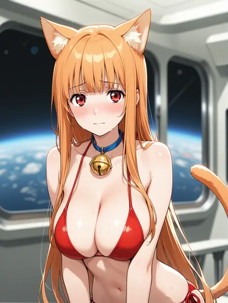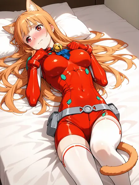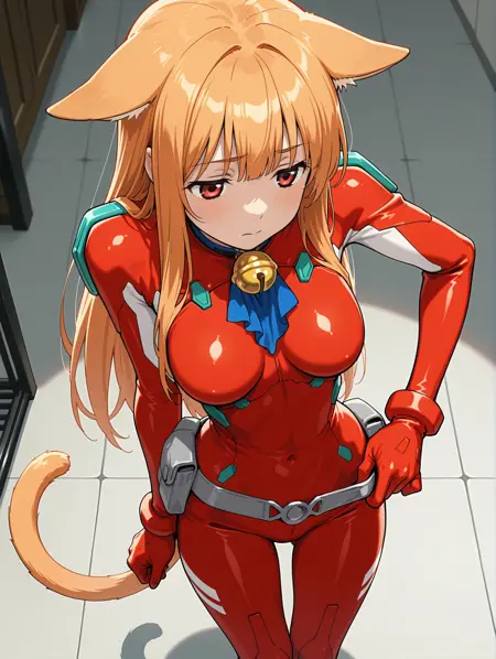 cpc-eris, red eyes, light orange hair, long hair, blunt bangs, cat ears, cat tail, neck bell, collar,