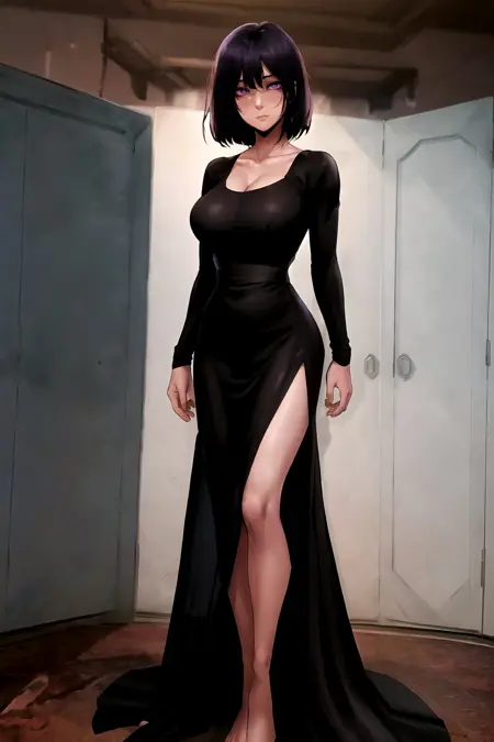 熟女、黒髪、短髪、紫の目、黒いドレス、大きな胸