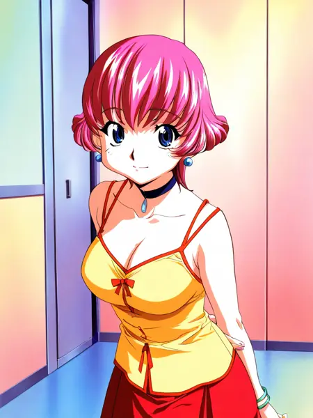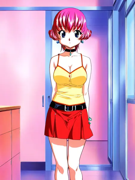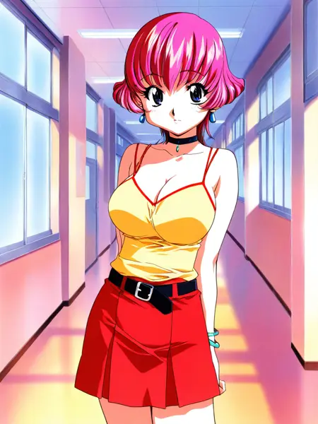 cleavage, red skirt, Yellow camisole, bracelet, black belt,