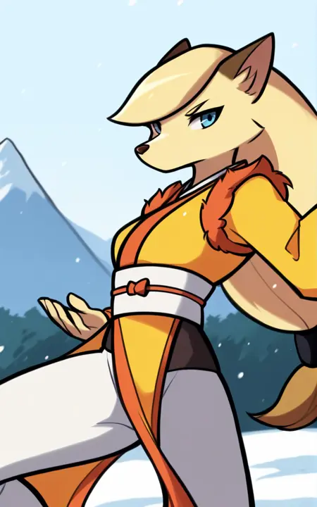 关于她的服装: 棕色鞋履,靴子,及膝靴,长裤,白裤,灯笼裤,腰帷,腰带,白腰带,黄色和服,日式服装,长袖