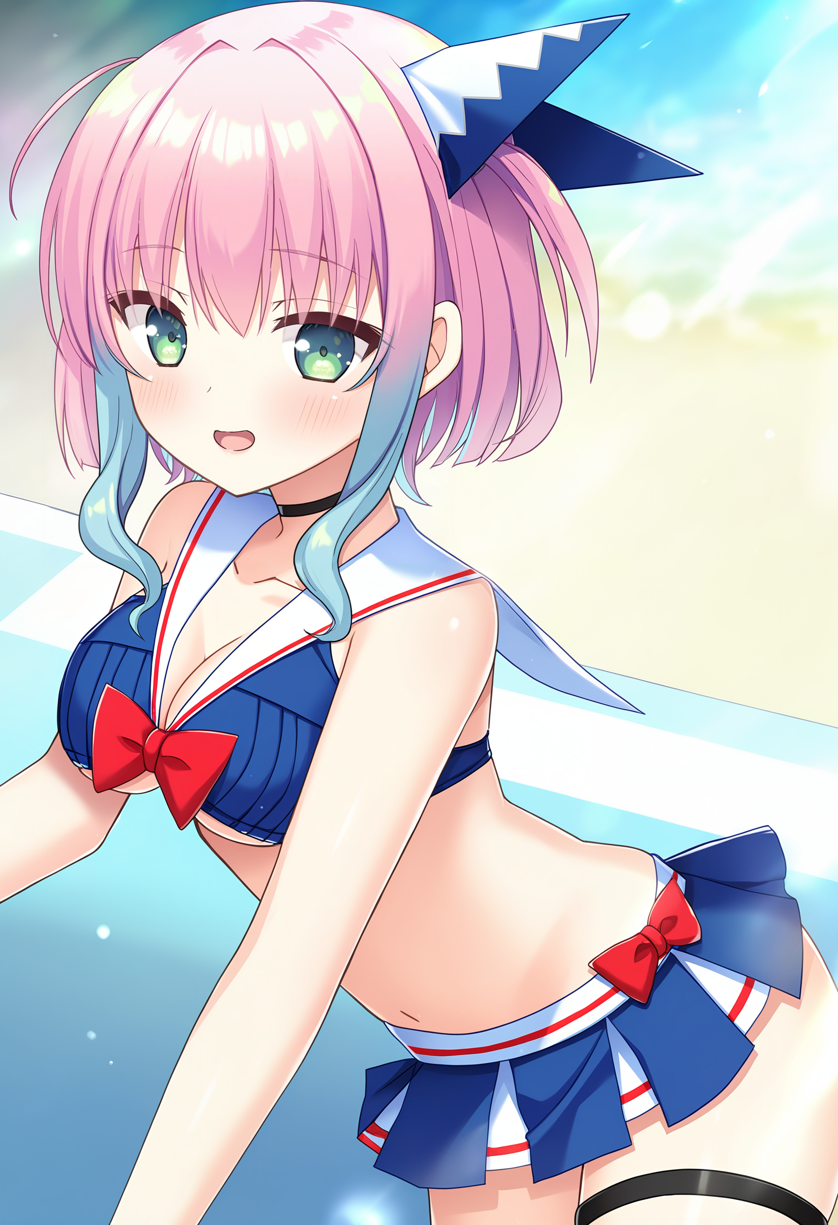 YONGYI,one side up,hair blue and white ornament,black choker,white sailor bikini,blue bikini,blue slit bikini skirt,bikini red bow,skirt red bow,thigh strap,