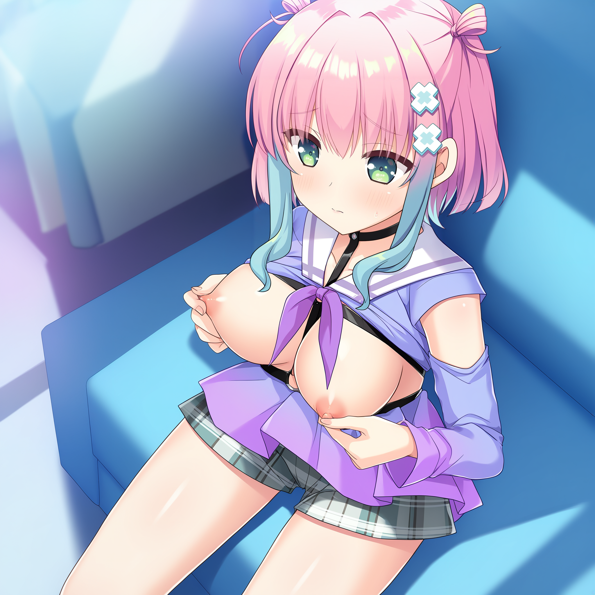 CHANGFU,double bun,x hairclips,black collar,white sailor collar,purple neckerchief,grey plaid shorts,purple gradient blouse,long detached sleeves,sleeves past wrists,criss-cross strings,black bracelet,
