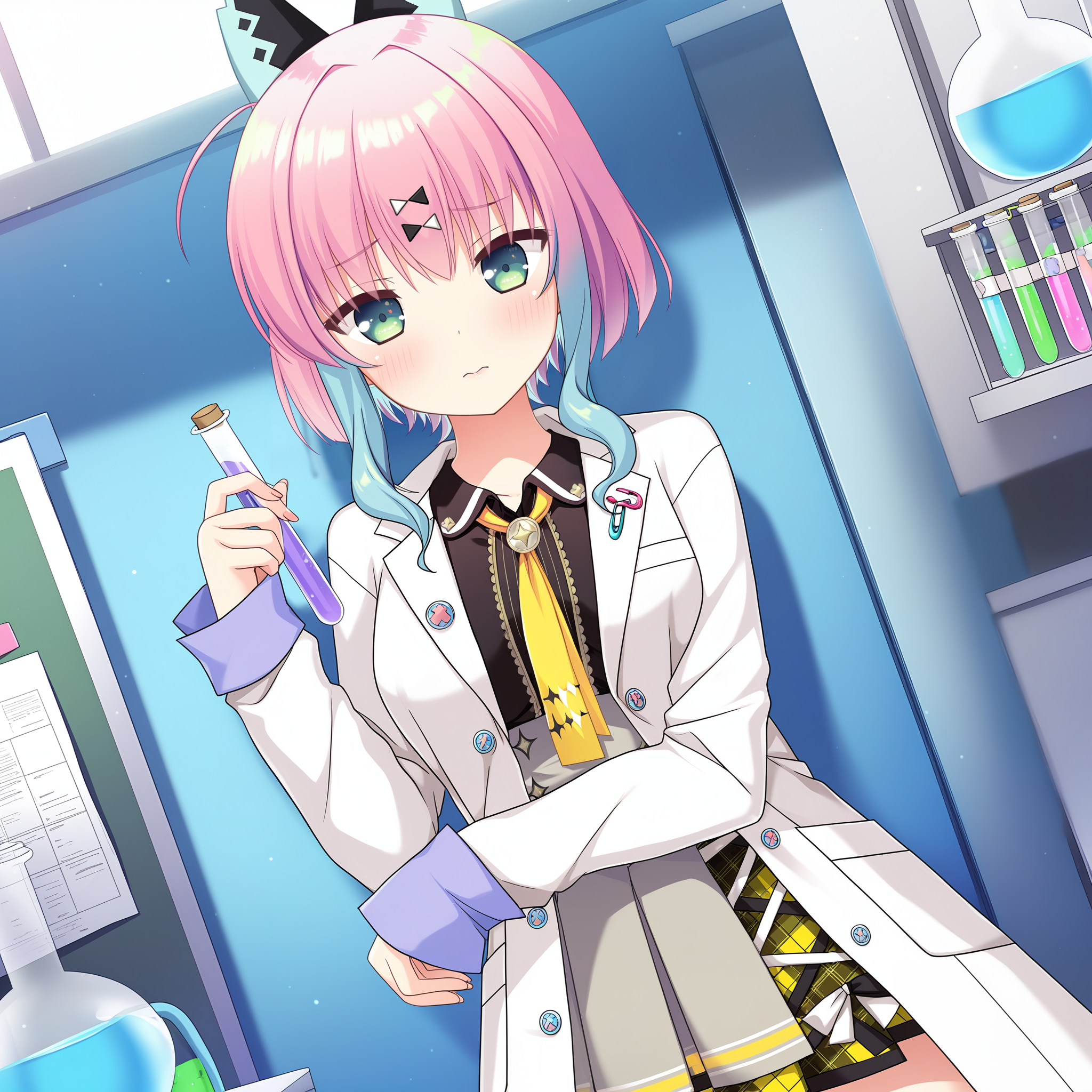 XF,fake animal ears,white and black hairclips,yellow necktie,black shirt,collared shirt,white lab coat,open coat,sleeves past wrists,grey high-waist skirt,yellow plaid skirt,cross-laced skirt,black trimmed skirt,paperclip,mismatched legwear,pink over-kneehigh,green thighhigh,legwear garter,