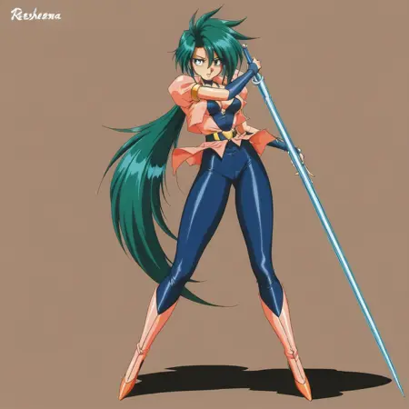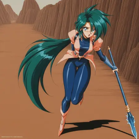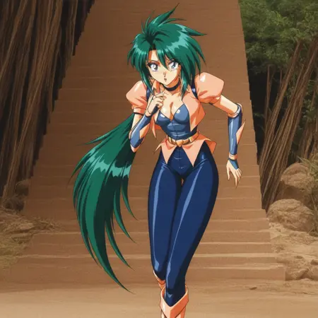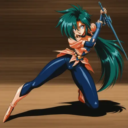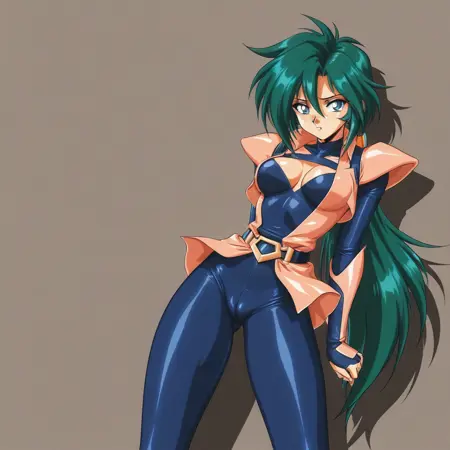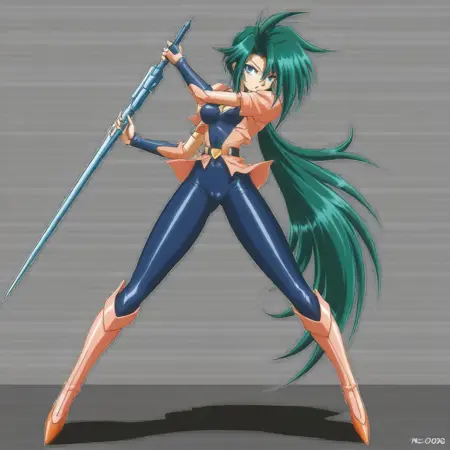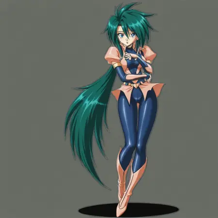 aqua hair, headband, long hair hair, very long hair, ponytail, crop top, blue crop top, knee boots, red eyes, spandex, skin tight, boots, blue bodysuit, shoulder pads, pink footwear, pink shoulder pads, bracer, very short skirt, pink skirt,