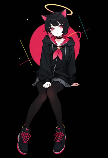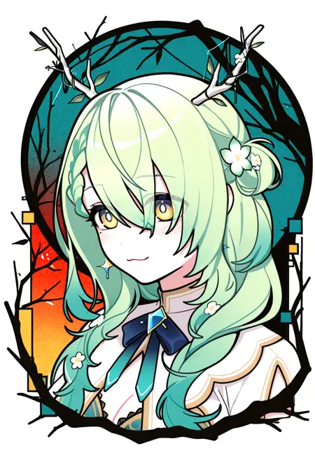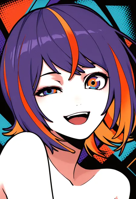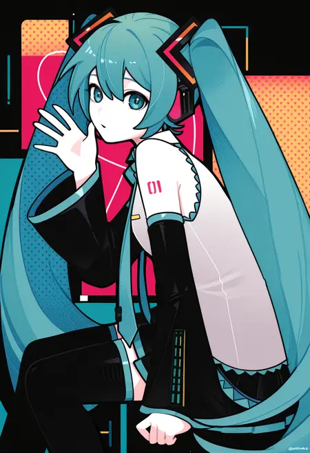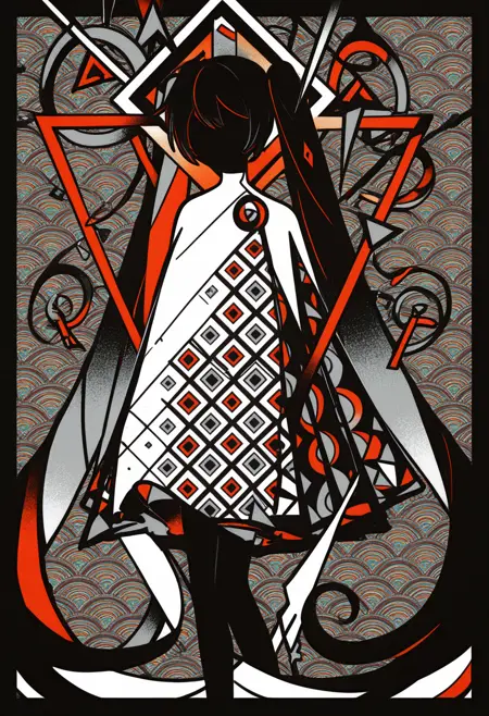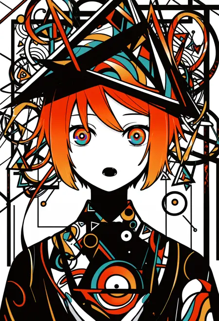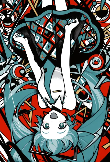 Machiga****mi Yoh's style is a blend of neo-pop surrealism and abstract art, focused on stylized anime characters. It is defined by the use of clean, geometric shapes, smooth color gradients, and sharp, flat lines that break down the image into distinct color planes. The artwork often features characters with large, luminous eyes, vibrant hair, and a melancholic yet pop-art aesthetic, set against simple or abstract backgrounds to maximize visual impact.