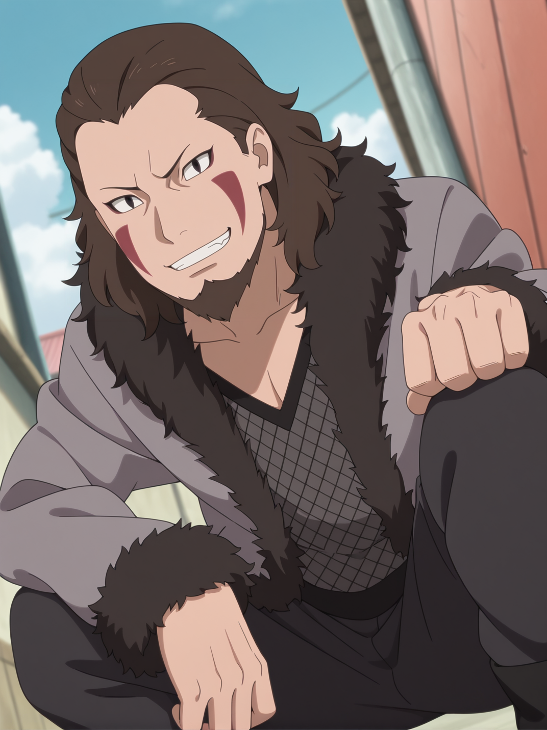 衣装ワード:"茶色の髪、顔の模様、ひげ、黒い目、ジャケット、フィッシュネット、毛皮のトリム、パンツ、サンダル"