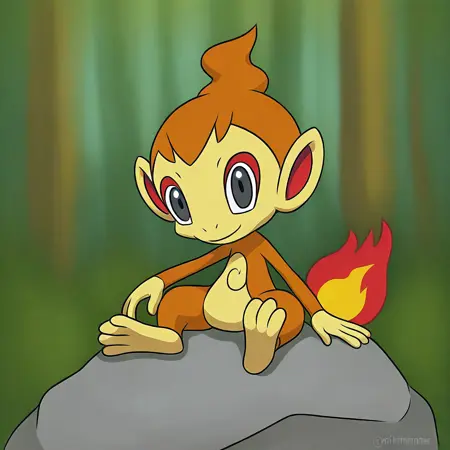 primate, monkey, orange and tan fur, black eyes, red eyeliner, red inner ears, fire tail,