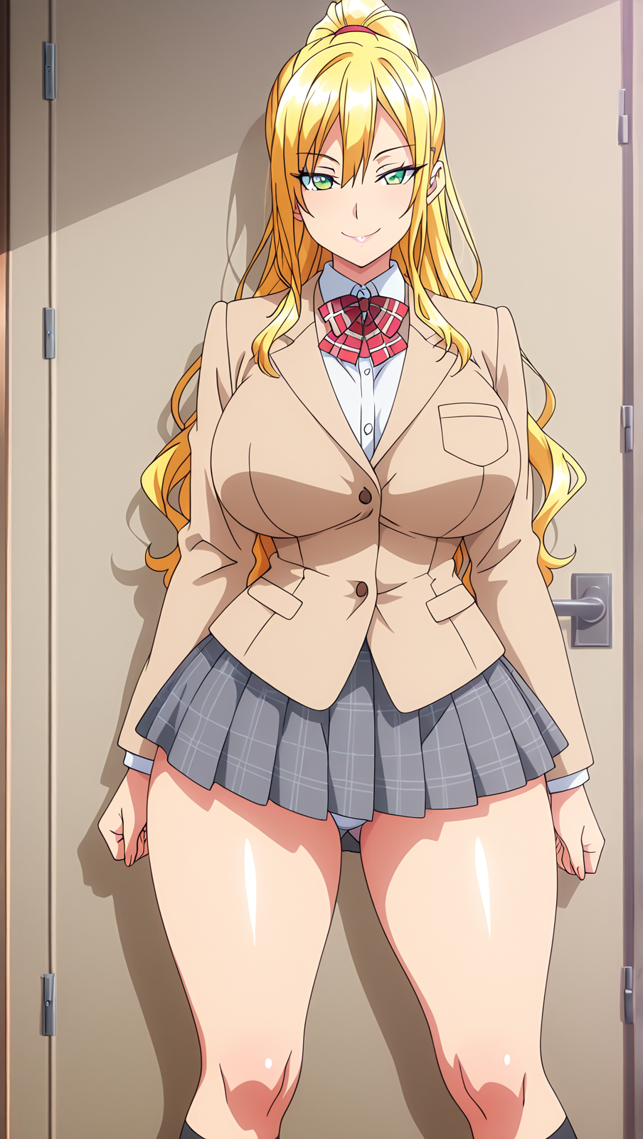 Rena, blonde hair, long hair, parted bangs, sideburns, ponytail, green eyes,