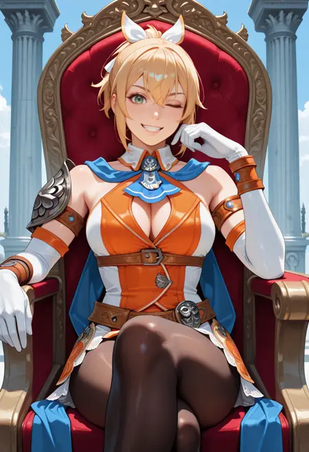 "CASS4NSC6,金色头发,发带,头发位于双眼之间,短侧发,白色和橙色无袖领连衣裙,蓝色领结,胸脯开叉,胸部腰带,蓝色围巾,露肩,皮质臂环,单肩甲,腰带,裙子,刺绣,连裤袜,白色肘部手套"