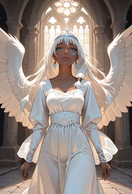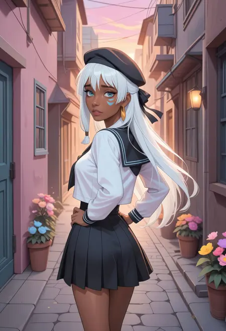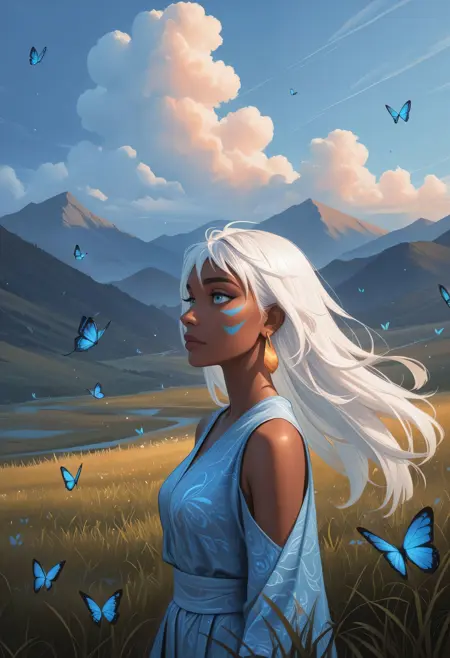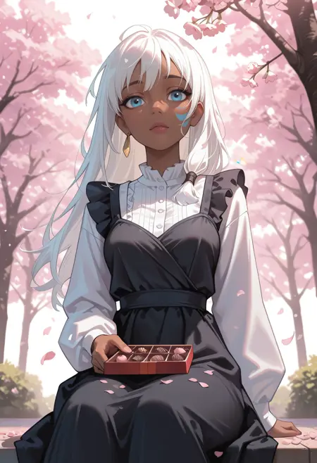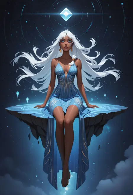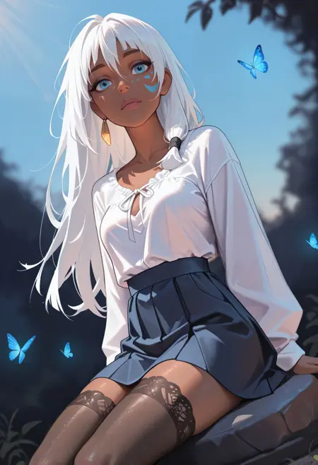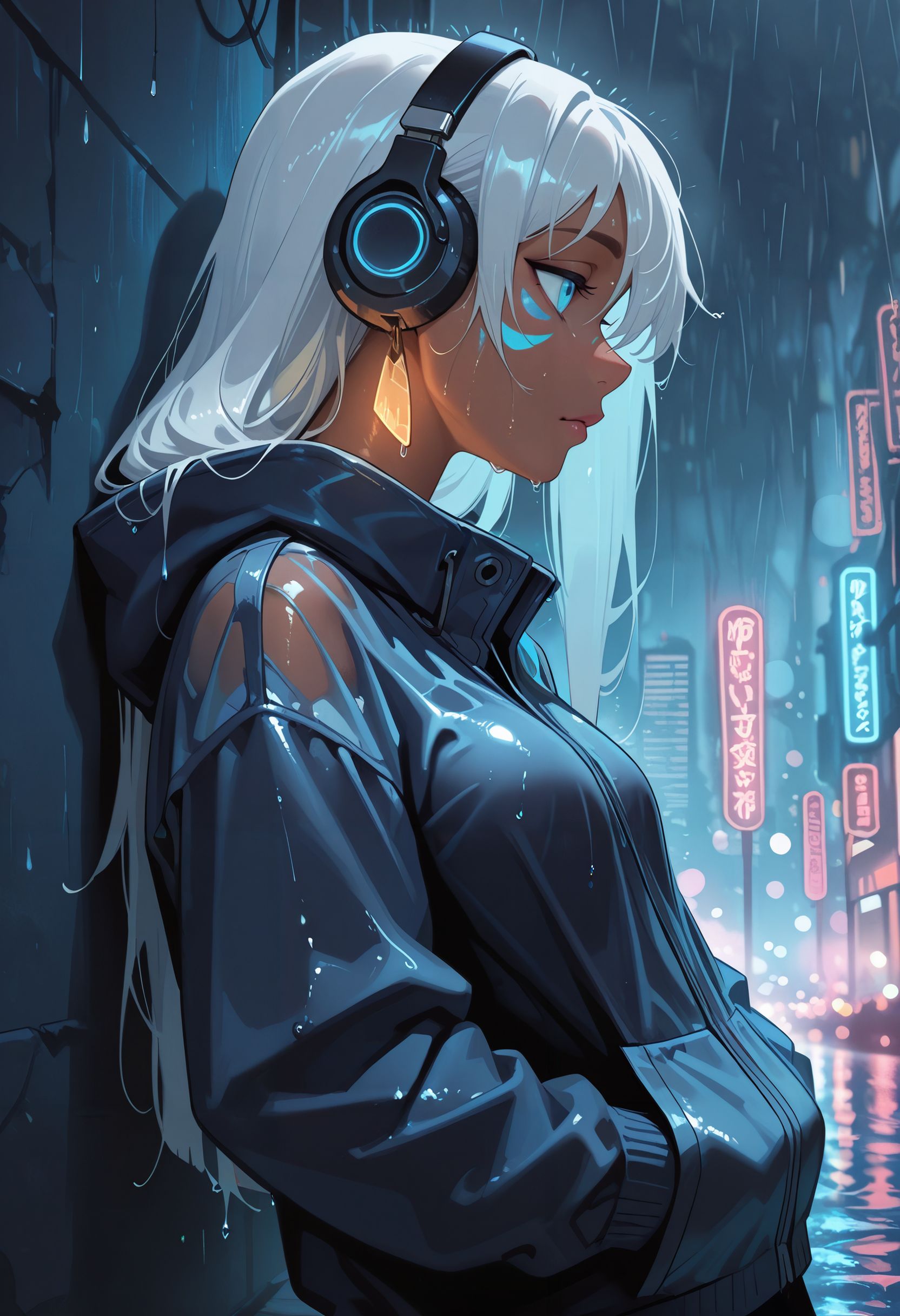 DAK1da, 1girl, dark-skinned female, long hair, white hair, blue eyes, facial mark, single earring
