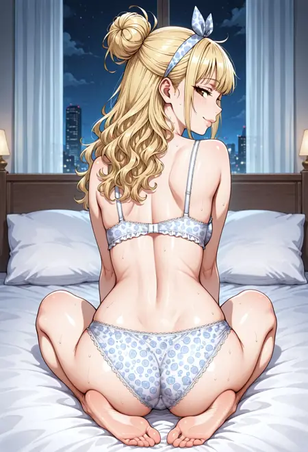 hair ornament, bow hairband, hairband, underwear only, white bra, print bra, frilled bra, lace-trimmed bra, white panties, print panties, lace-trimmed panties, barefoot