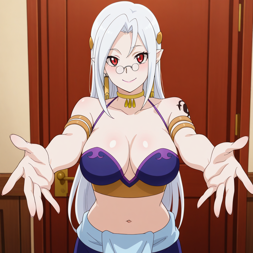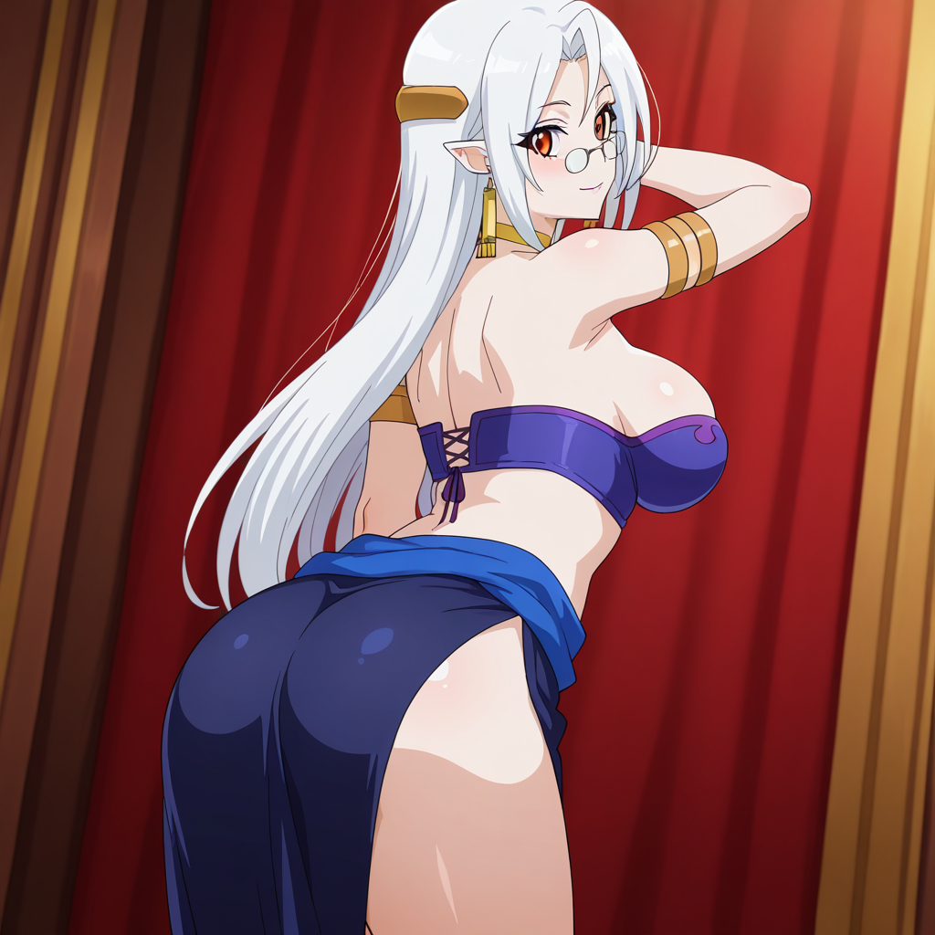 Hekaterina, 1girl, solo, long hair, white hair, large breasts, pointy ears, glasses, red eyes, choker, bustier, cleavage, navel, armlet, midriff, skirt, jewelry, earrings