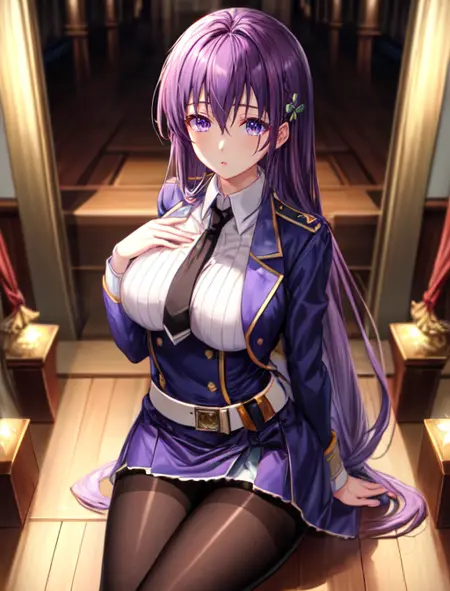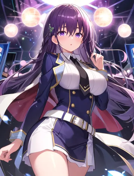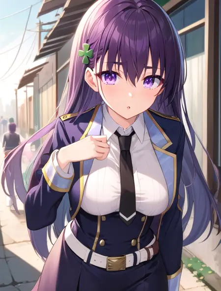 Additional words that may help: purple hair, hair ornament, purple eyes, student uniform, open jacket, black tie, white belt