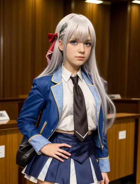 Additional words that may help: red hair ribbon, white hair, blue eyes, student uniform, open jacket, blue skirt,