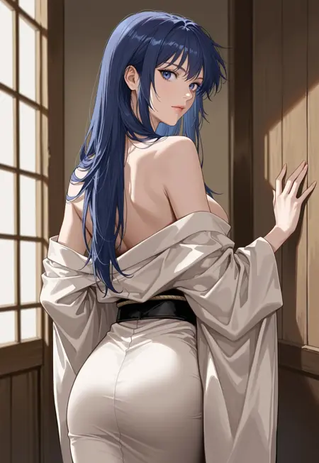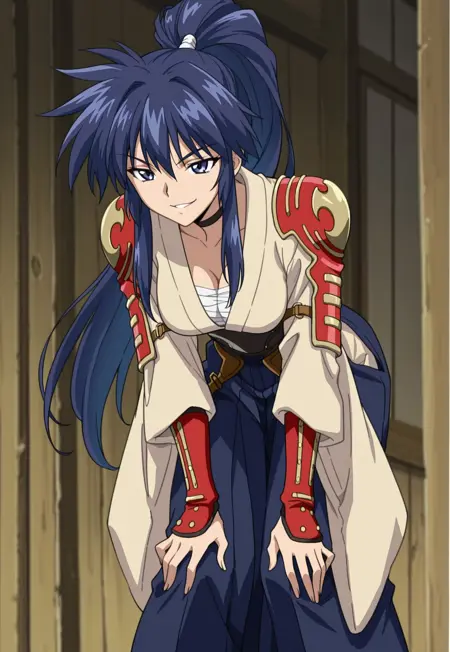 kimono, sarashi, shoulder armor, vambraces, wide sleeves, leather obi, blue hakama, choker,