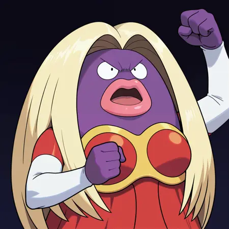 pokemone female, purple skin, blonde hair, long hair, black eyes, big lips
