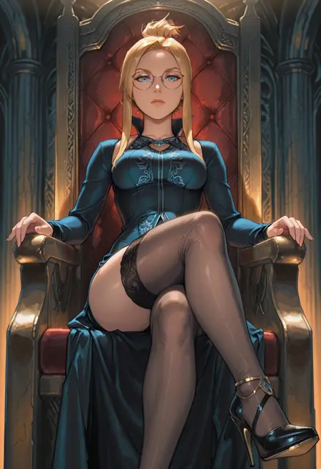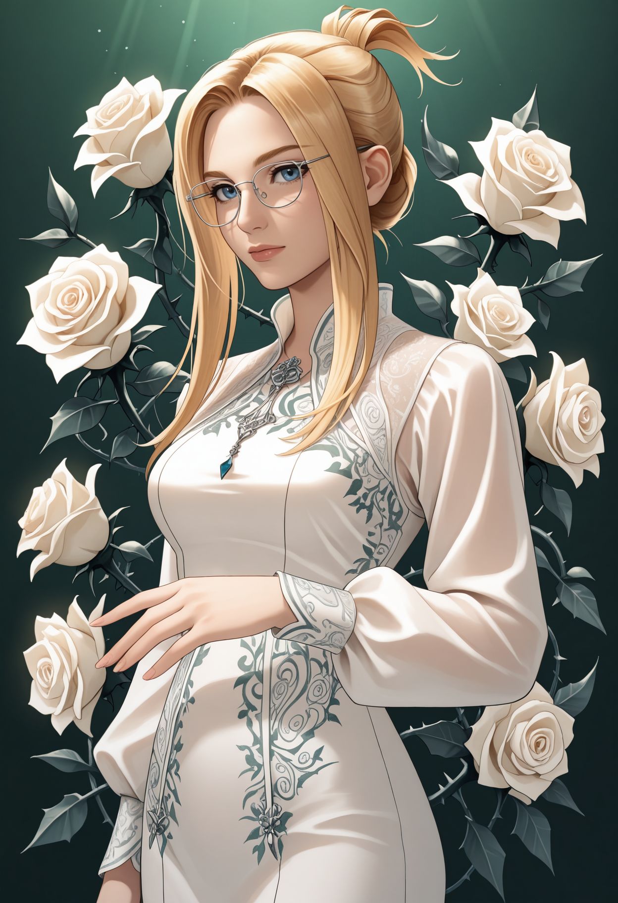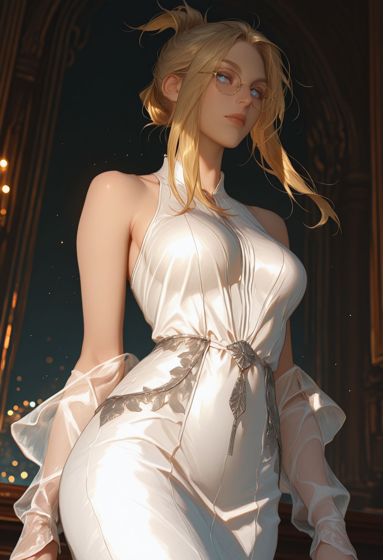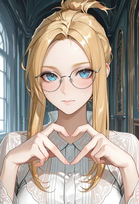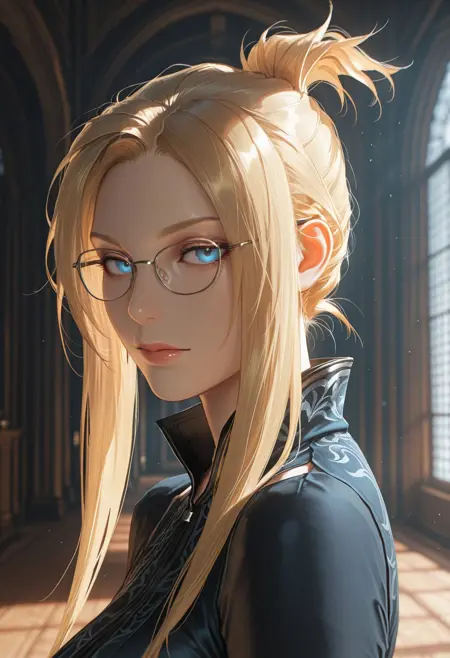 FF8Qu1st1s, 1girl, blue eyes, blonde hair, sidelocks, hair up, glasses