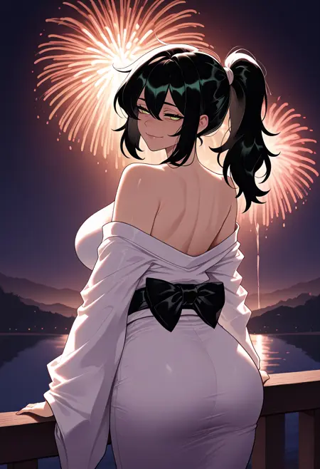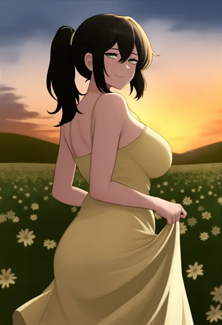 외모: mature female, long hair, black hair, hair between eyes, ponytail, green eyes