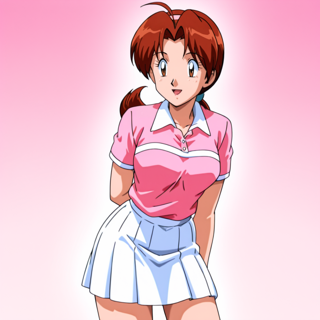 触发词:DeliaPokemon, 1girl, 蓝色裙子, 棕色头发, 复古艺术风格, 1990年代(风格), 马尾辫, 成熟女性, 上衣, 短袖, 分开的刘海, 西部镜头
