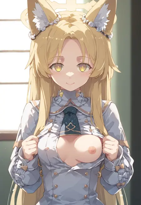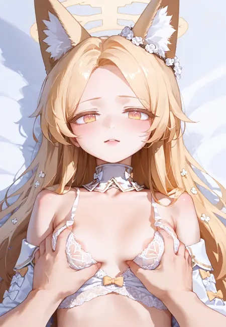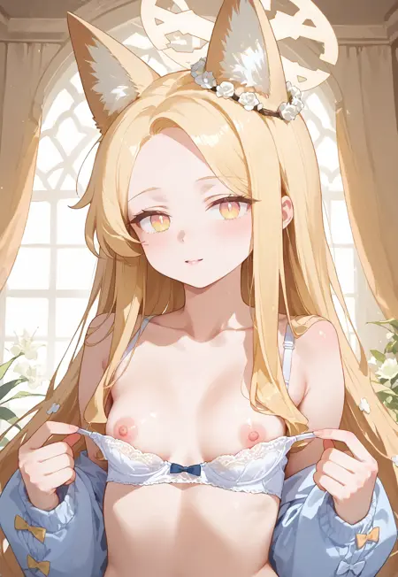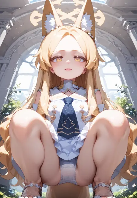 Trigger: 1girl, solo, blonde hair, yellow eyes, fox ears, halo, long hair