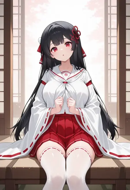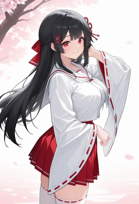 black hair,straight hair,flower knot,hair bow,red bow,red skirt,pleated skirt,white sailor collar,white neckerchief,white shirt,wide sleeves,ribbon-trimmed sleeves, ribbon-trimmed thighhighs,