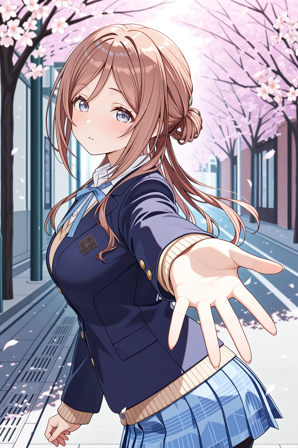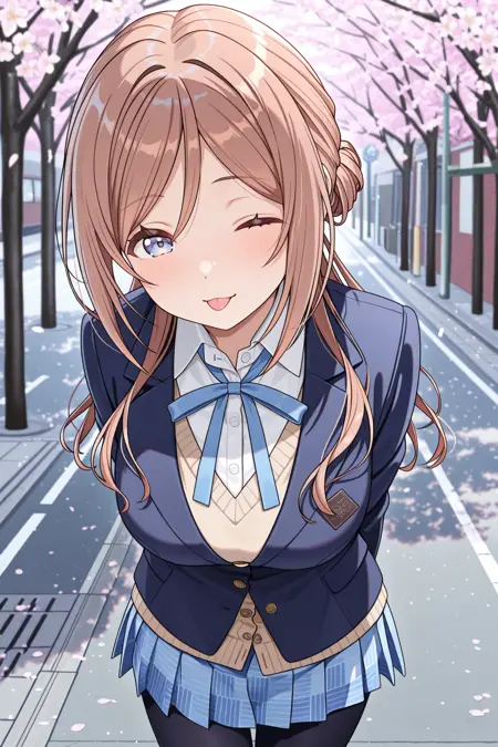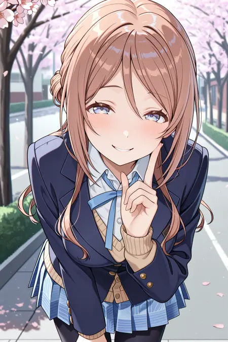collared shirt, blue jacket, long sleeves, brown cardigan, blue ribbon, blue skirt, pleated skirt, black pantyhose, hatsuboshi gakuen school uniform,
